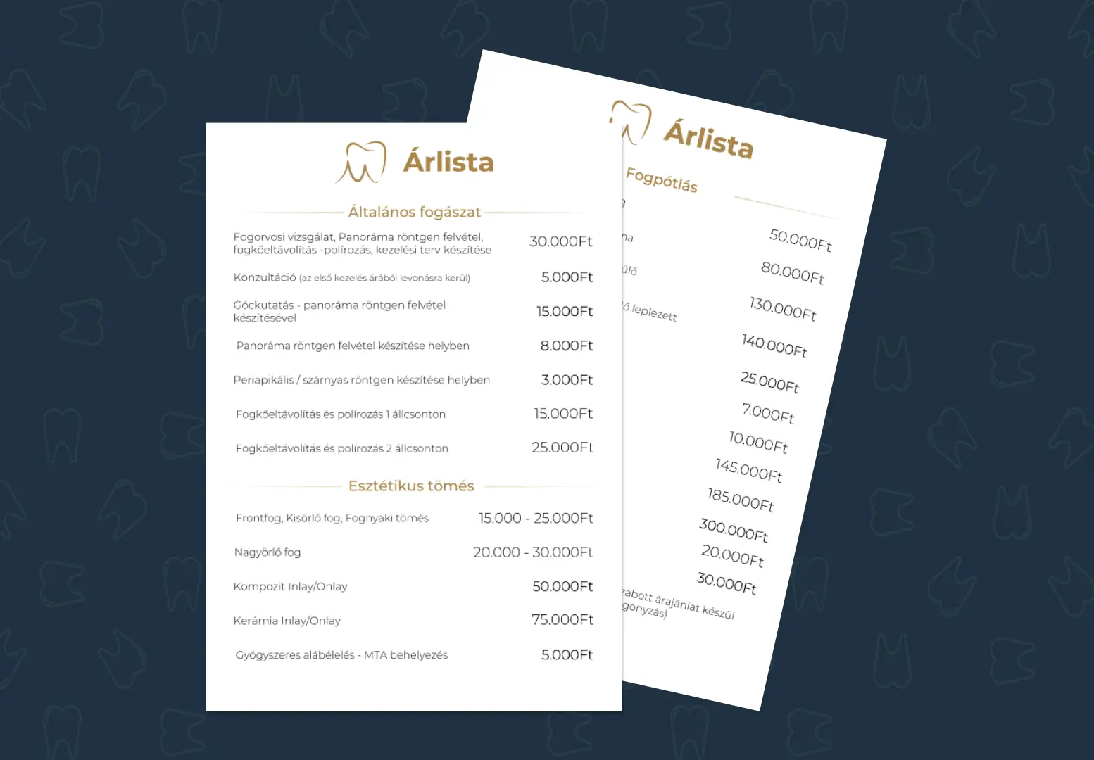 A weboldal mellett vizuális elemeket is terveztünk a rendelő számára. Elkészítettük a logót, valamint az ehhez illeszkedő árlistát és névjegykártyát, hogy az online és offline megjelenés egységes képet mutasson. Ezek az anyagok a weboldal stílusához igazodnak, így a rendelő kommunikációja minden felületen következetes marad.