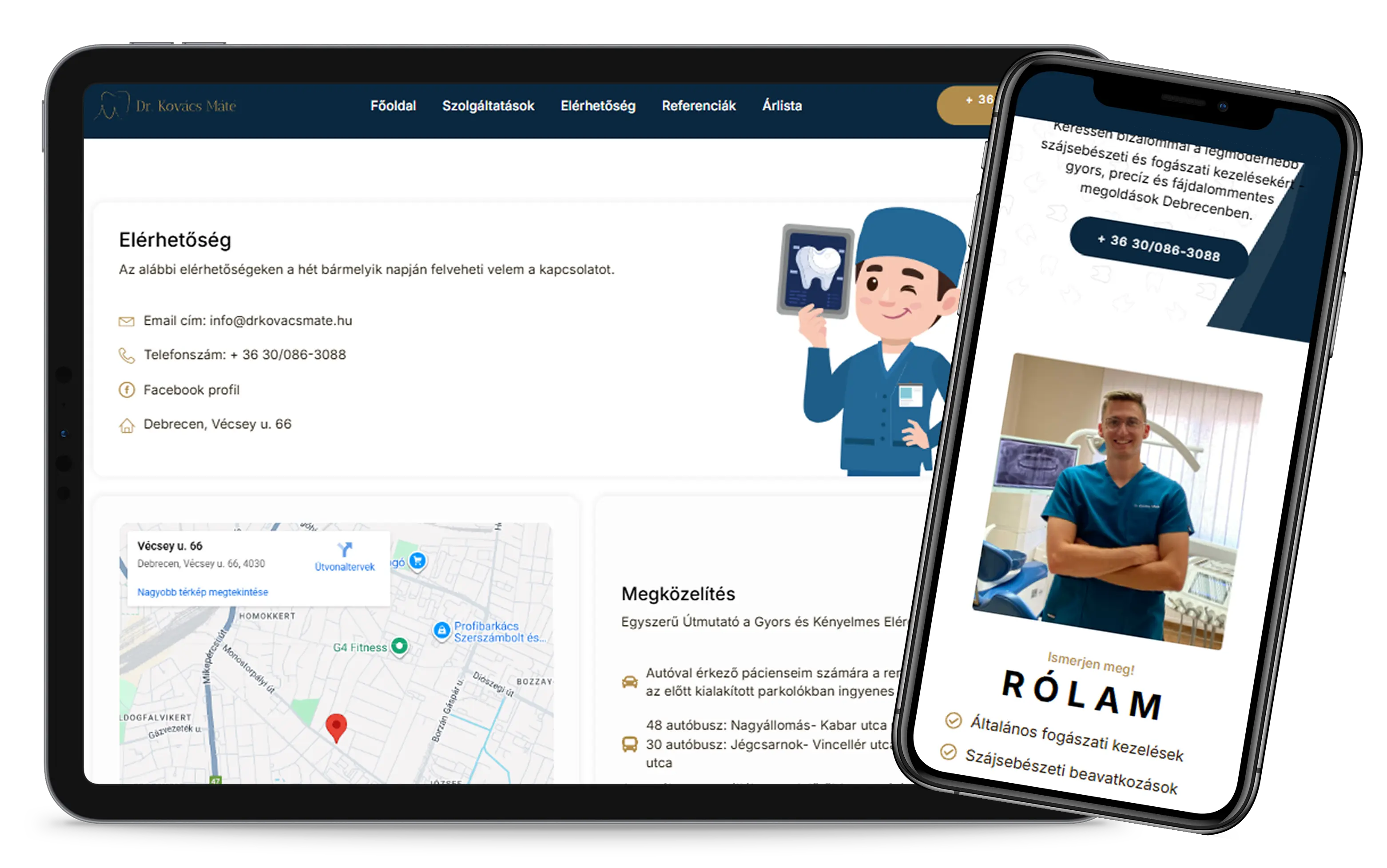 A fejlesztés során kiemelten figyeltünk arra, hogy a weboldal reszponzív legyen, és minden eszközön megfelelően jelenjen meg. Asztali gépen, tableten és mobiltelefonon egyaránt jól használható felület készült, amely kényelmes böngészést biztosít a páciensek számára. A technikai megoldások célja a stabil működés és a hosszú távon is megbízható online jelenlét kialakítása volt.